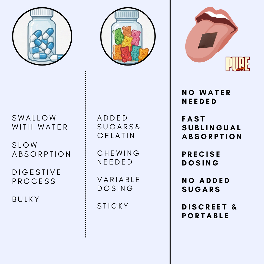 After dissolving in the saliva, the ingredients are then absorbed into the oral cavities and into the bloodstream. In comparison, gummies and capsules need to go through the digestive system to be broken down and absorbed first.